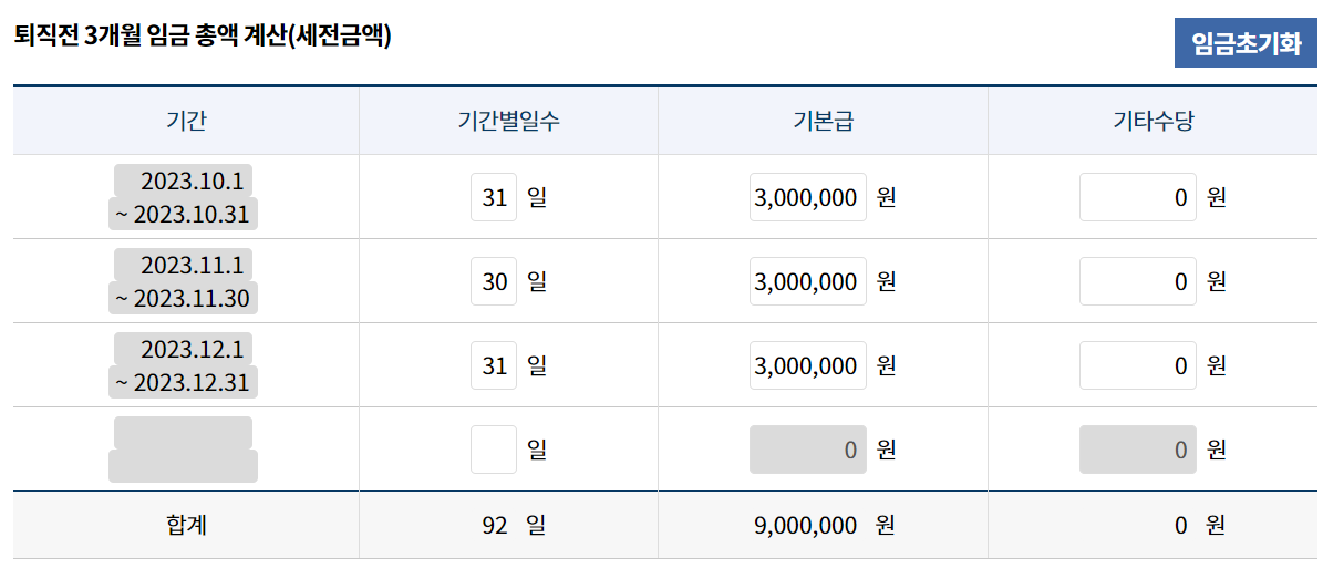 이와 같이 내 퇴사일 직전날로부터 3개월 동안의 기간이 자동으로 입력되며, 이에 내가 직접 받고있던 월 급여를 기본급 표기란에 기입해주어야 합니다. 만약 일률적이고 정기적으로 받은 기타수당등이 있다면, 오른쪽 기타수당 표기란에 입력해주시기 바랍니다.