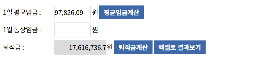 이제 거의다 계산되었습니다. 하단 평균임금계산과 퇴직금계산 버튼을 각각 클릭해주어야 실질적으로 내가 받게되는 퇴직금을 확인해볼 수 있습니다.