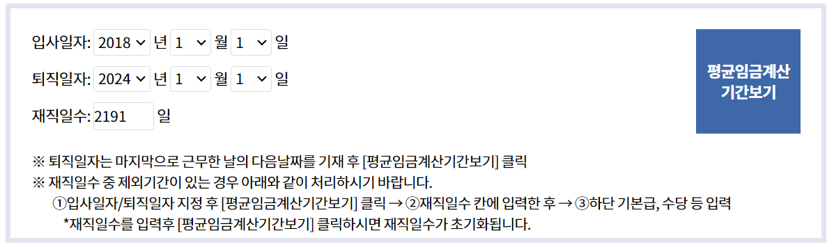 먼저 입사일자와 퇴직일자를 입력해줍니다. 퇴직일자는 마지막으로 근무한 날의 다음날짜를 입력해주시면 됩니다. 입사일자와 퇴직일자는 누구나 알고 있기 때문에 아래와 같이 입력했을 때 바로 평균임금계산 기간보기를 클릭 하시면 하단 3개월의 임금총액 계산에 자동으로 입력됩니다.