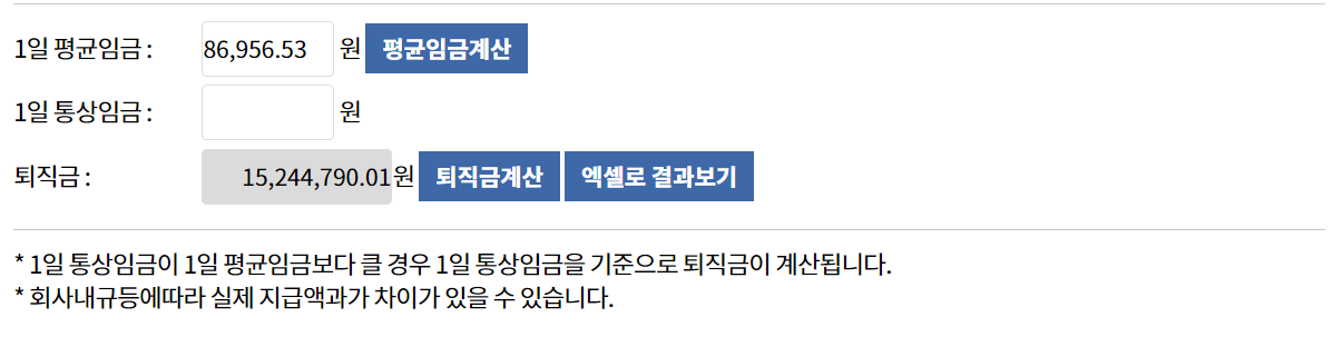 퇴직금 계산을 클릭 시 퇴직금이 15,244,790원으로 계산되는데요, 평균임금도 함께 확인할 수 있습니다.