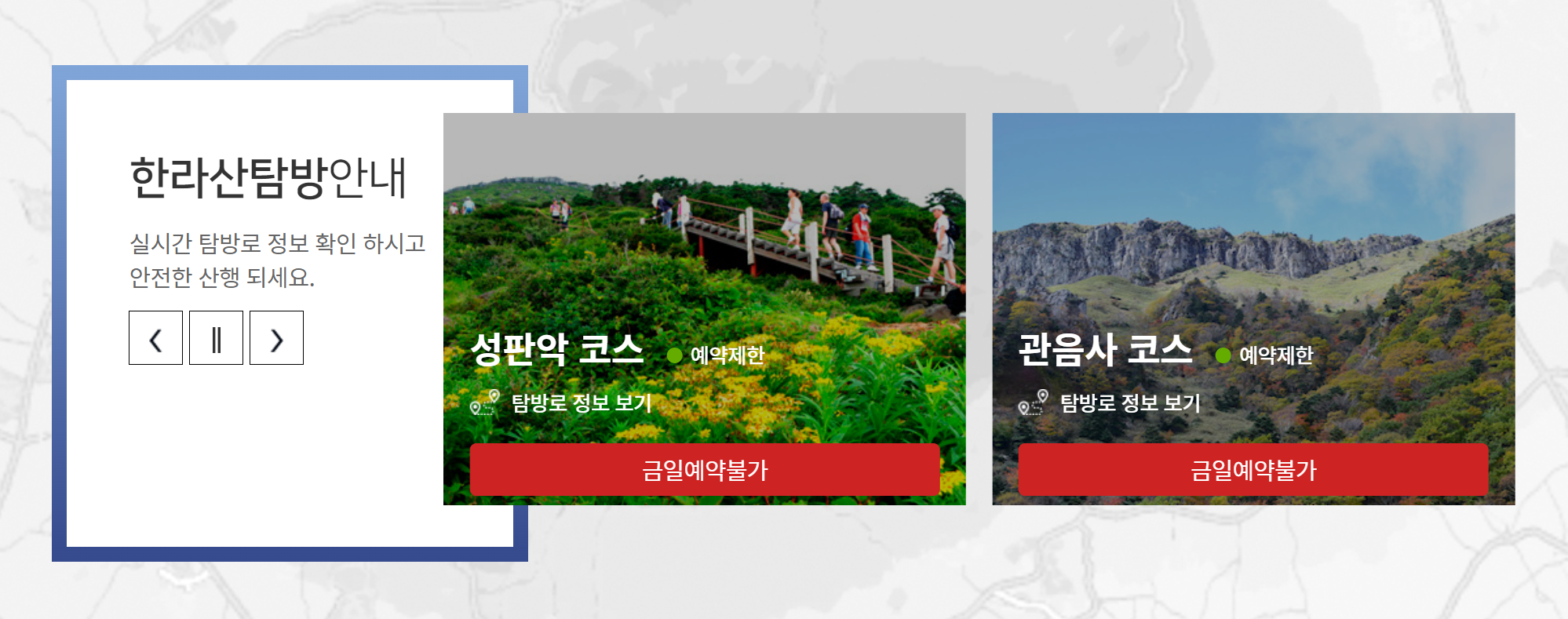 한라산은 현재 탐방 예약시스템을 거쳐서 예약 후에 탐방이 가능한데요, 성판악 코스나 관음사 코스를 예약하려는 분들은 아래 버튼을 통해 한라산 탐방 예약시스템으로 이동해보시겠습니다.
