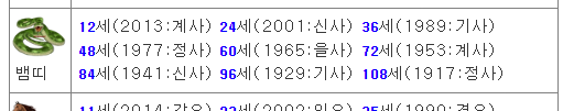 뱀띠의 생년월일으로 올해 나이를 확인해 보려면 아래 이미지를 보시면 됩니다. 2024년 기준으로 2013년생은 12세이며 2025년도가 되면 이제 뱀띠가 1세가 되겠습니다.