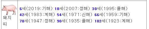2019년생 기해해에 태어난 아이들은 올해 6세 입니다. 2007년생, 1995년생, 1984년생, 1971년생, 1959년생 등 돼지띠 이신 분들은 올해 나이가 몇일까요?